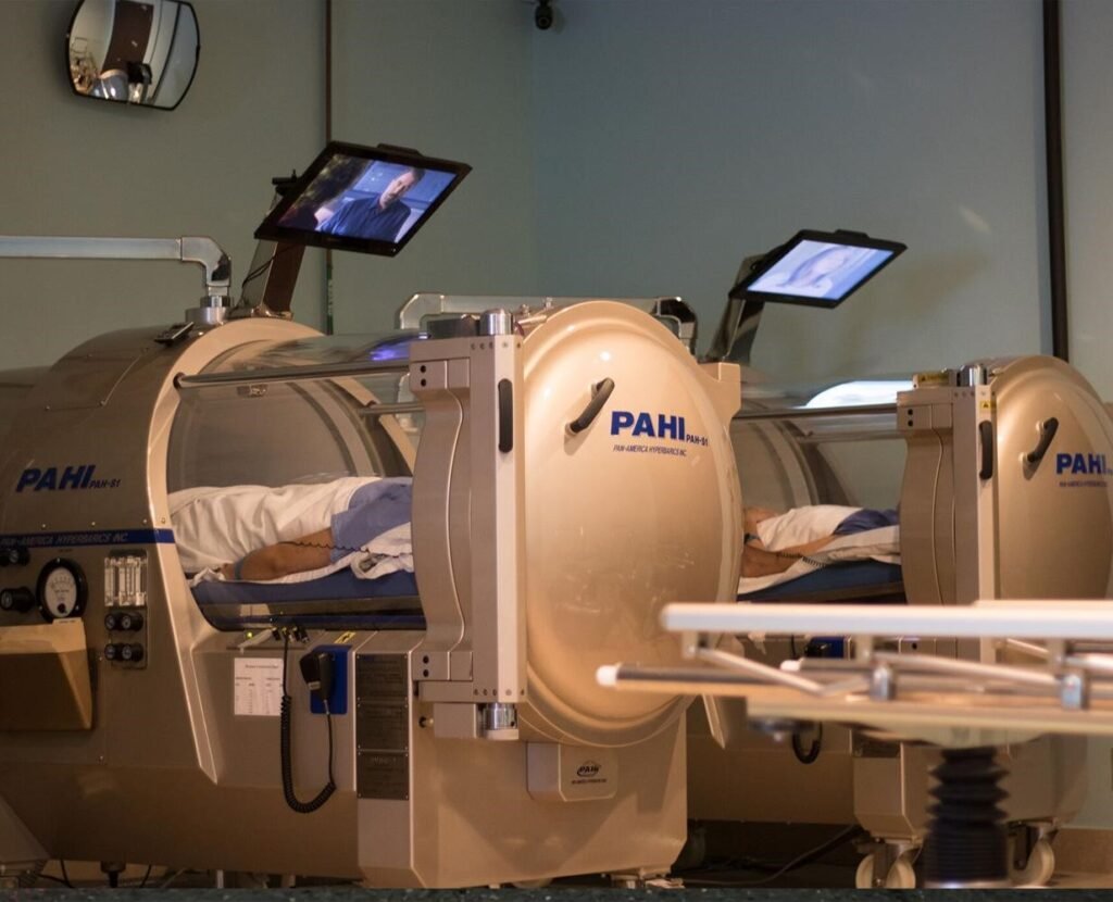 A hyperbaric chamber is a special room that helps your body heal by giving you a lot of oxygen. The room is sealed and pressurized, like a submarine, and you breathe in 100% oxygen while you're inside.