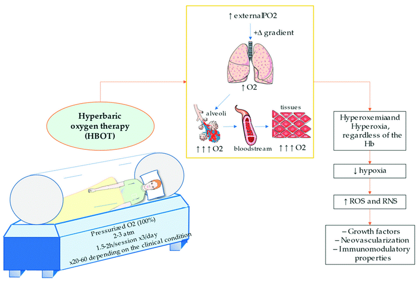 HBOT has anti-inflammatory properties, which can help reduce swelling and promote healing by decreasing the production of pro-inflammatory cytokines and increasing the production of anti-inflammatory cytokines.